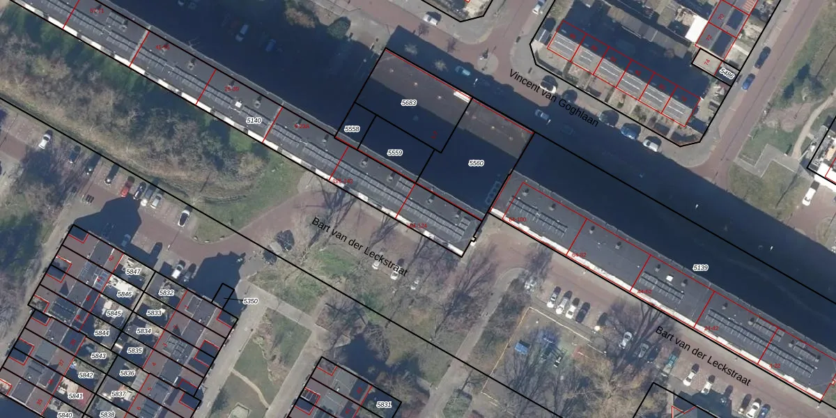Het perceel waarop Bart van der Leckstraat 112 staat heeft een oppervlakte van 1379 m². Dit is een zeer groot perceel. De perceeloppervlakte wordt geregistreerd door het Kadaster. Gedetailleerde informatie over de maten van dit perceel kunt u vinden in het rapport Kadastrale kaart met maatvoering van Bart van der Leckstraat 112.