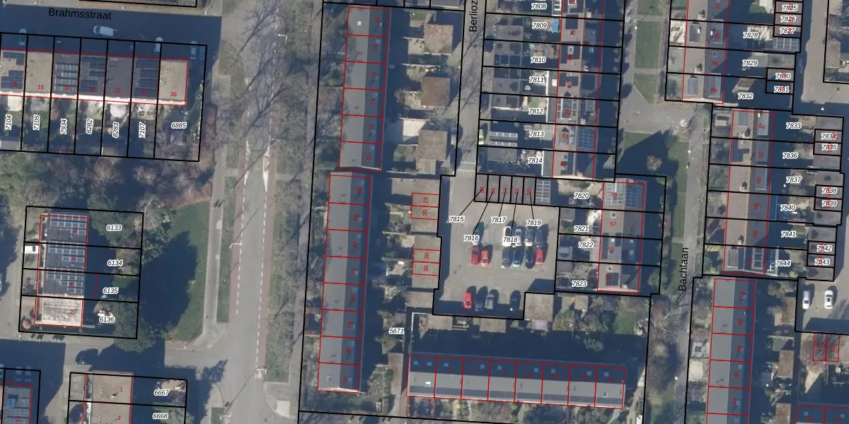 Het perceel waarop Berliozstraat 30 staat heeft een oppervlakte van 4564 m². Dit is een zeer groot perceel. De perceeloppervlakte wordt geregistreerd door het Kadaster. Gedetailleerde informatie over de maten van dit perceel kunt u vinden in het rapport Kadastrale kaart met maatvoering van Berliozstraat 30.