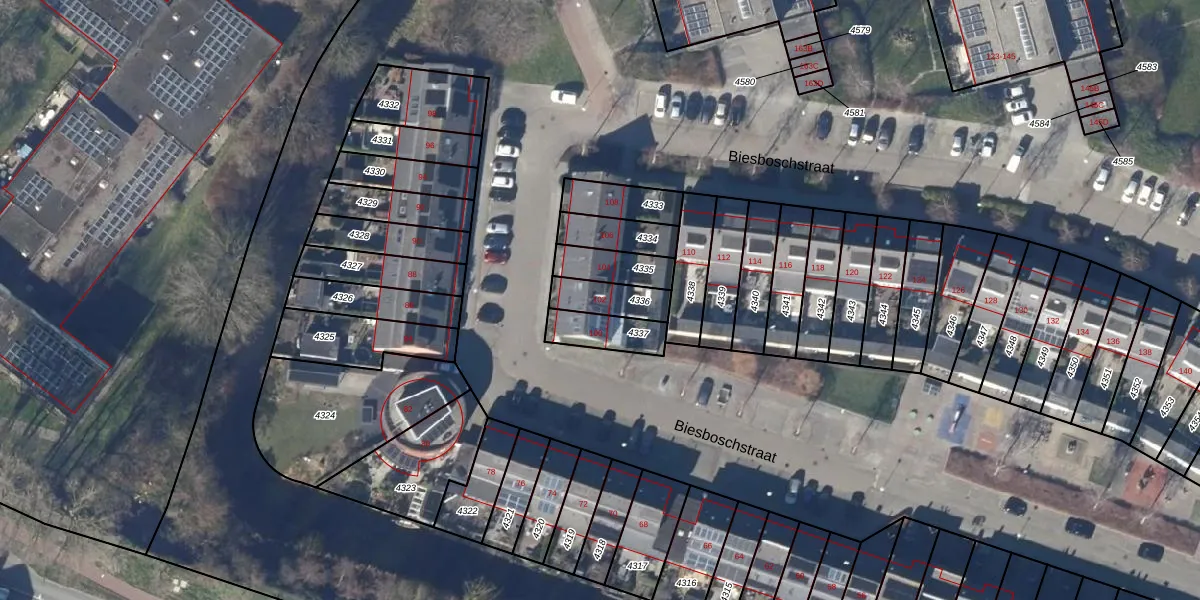 Het perceel waarop Biesboschstraat 102 staat heeft een oppervlakte van 108 m². Dit is een middelgroot perceel. De perceeloppervlakte wordt geregistreerd door het Kadaster. Gedetailleerde informatie over de maten van dit perceel kunt u vinden in het rapport Kadastrale kaart met maatvoering van Biesboschstraat 102.