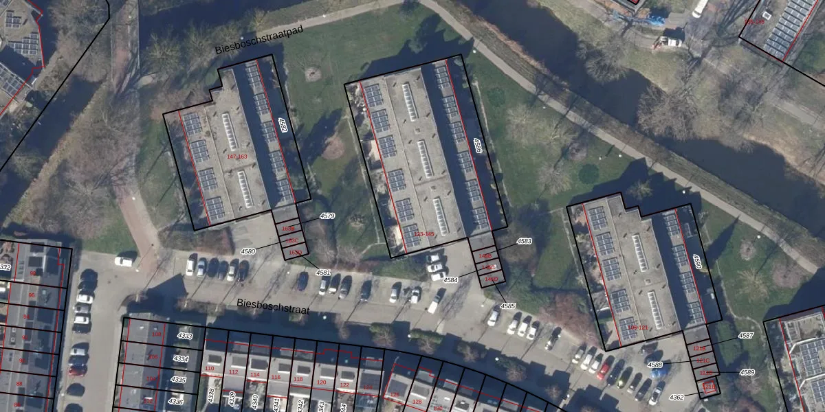 Het perceel waarop Biesboschstraat 125 staat heeft een oppervlakte van 1298 m². Dit is een zeer groot perceel. De perceeloppervlakte wordt geregistreerd door het Kadaster. Gedetailleerde informatie over de maten van dit perceel kunt u vinden in het rapport Kadastrale kaart met maatvoering van Biesboschstraat 125.