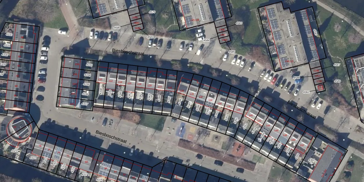 Het perceel waarop Biesboschstraat 126 staat heeft een oppervlakte van 173 m². Dit is een middelgroot perceel. De perceeloppervlakte wordt geregistreerd door het Kadaster. Gedetailleerde informatie over de maten van dit perceel kunt u vinden in het rapport Kadastrale kaart met maatvoering van Biesboschstraat 126.