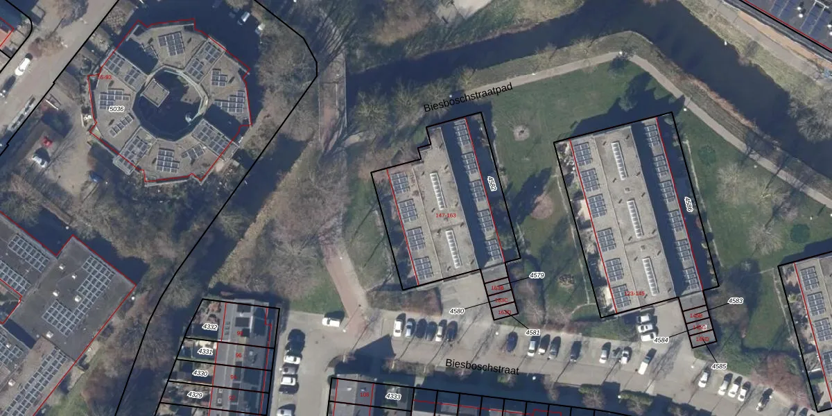 Het perceel waarop Biesboschstraat 151 staat heeft een oppervlakte van 986 m². Dit is een groot perceel. De perceeloppervlakte wordt geregistreerd door het Kadaster. Gedetailleerde informatie over de maten van dit perceel kunt u vinden in het rapport Kadastrale kaart met maatvoering van Biesboschstraat 151.