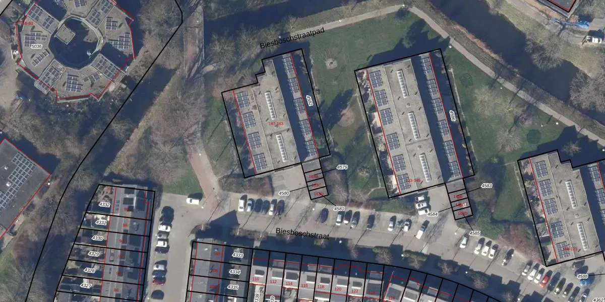 Biesboschstraat 163 is gelegen op kadastraal perceel ODP02A4582. Deze kadastrale aanduiding is uniek en wordt gebruikt door het Kadaster om eigendomsrechten en andere zakelijke rechten vast te leggen. Het perceel maakt onderdeel uit van de kadastrale gemeente Oudorp.