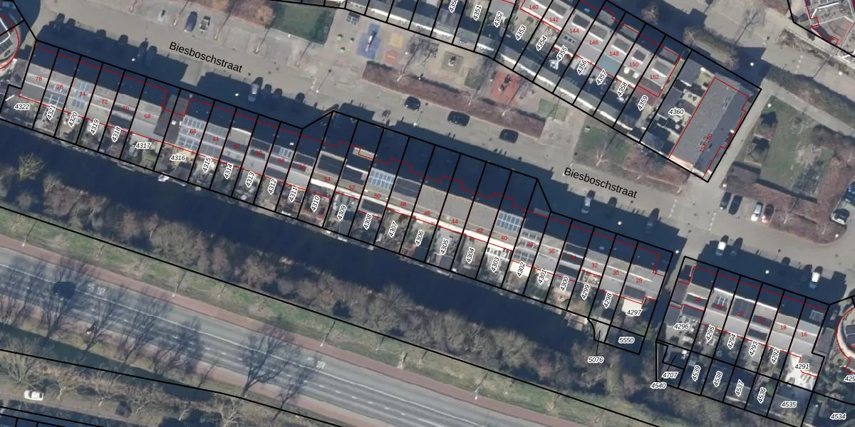 Het perceel waarop Biesboschstraat 46 staat heeft een oppervlakte van 170 m². Dit is een middelgroot perceel. De perceeloppervlakte wordt geregistreerd door het Kadaster. Gedetailleerde informatie over de maten van dit perceel kunt u vinden in het rapport Kadastrale kaart met maatvoering van Biesboschstraat 46.