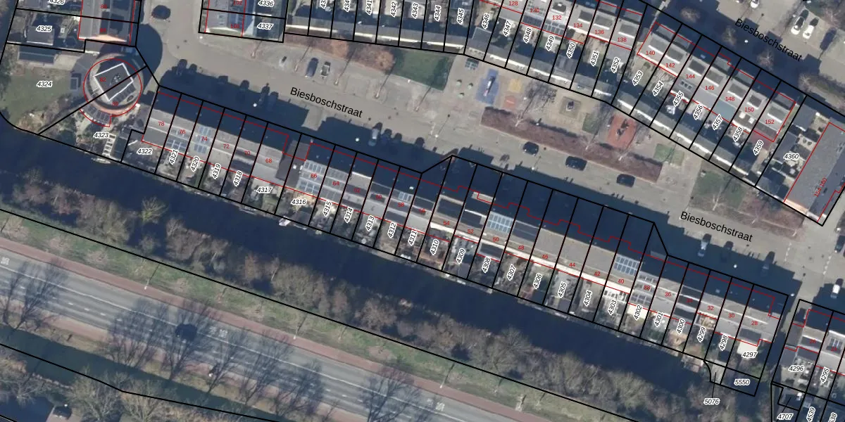 Het perceel waarop Biesboschstraat 56 staat heeft een oppervlakte van 128 m². Dit is een middelgroot perceel. De perceeloppervlakte wordt geregistreerd door het Kadaster. Gedetailleerde informatie over de maten van dit perceel kunt u vinden in het rapport Kadastrale kaart met maatvoering van Biesboschstraat 56.