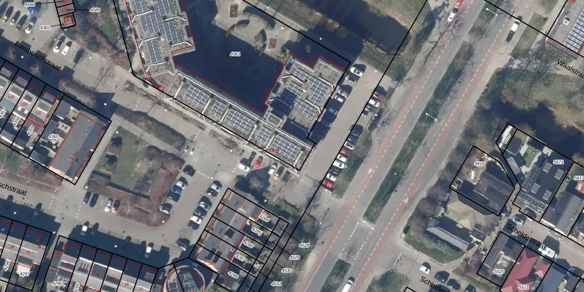Het perceel waarop Biesboschstraat 59 staat heeft een oppervlakte van 3177 m². Dit is een zeer groot perceel. De perceeloppervlakte wordt geregistreerd door het Kadaster. Gedetailleerde informatie over de maten van dit perceel kunt u vinden in het rapport Kadastrale kaart met maatvoering van Biesboschstraat 59.
