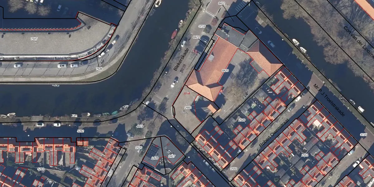Het perceel waarop Blekerskade 13 staat heeft een oppervlakte van 443 m². Dit is een groot perceel. De perceeloppervlakte wordt geregistreerd door het Kadaster. Gedetailleerde informatie over de maten van dit perceel kunt u vinden in het rapport Kadastrale kaart met maatvoering van Blekerskade 13.