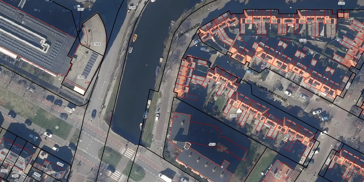 Het perceel waarop Blekerskade 35 staat heeft een oppervlakte van 1935 m². Dit is een zeer groot perceel. De perceeloppervlakte wordt geregistreerd door het Kadaster. Gedetailleerde informatie over de maten van dit perceel kunt u vinden in het rapport Kadastrale kaart met maatvoering van Blekerskade 35.