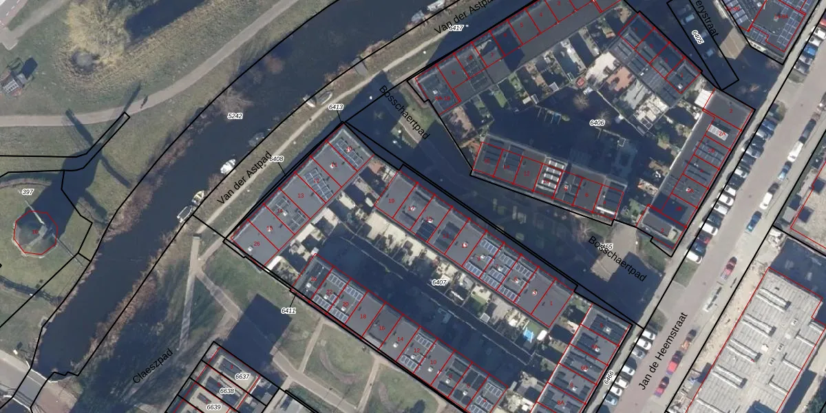 Het perceel waarop Bosschaertpad 17 staat heeft een oppervlakte van 3630 m². Dit is een zeer groot perceel. De perceeloppervlakte wordt geregistreerd door het Kadaster. Gedetailleerde informatie over de maten van dit perceel kunt u vinden in het rapport Kadastrale kaart met maatvoering van Bosschaertpad 17.