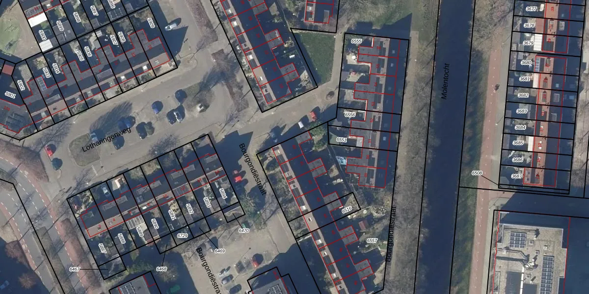 Het perceel waarop Bourgondiëstraat 40 staat heeft een oppervlakte van 1726 m². Dit is een zeer groot perceel. De perceeloppervlakte wordt geregistreerd door het Kadaster. Gedetailleerde informatie over de maten van dit perceel kunt u vinden in het rapport Kadastrale kaart met maatvoering van Bourgondiëstraat 40.