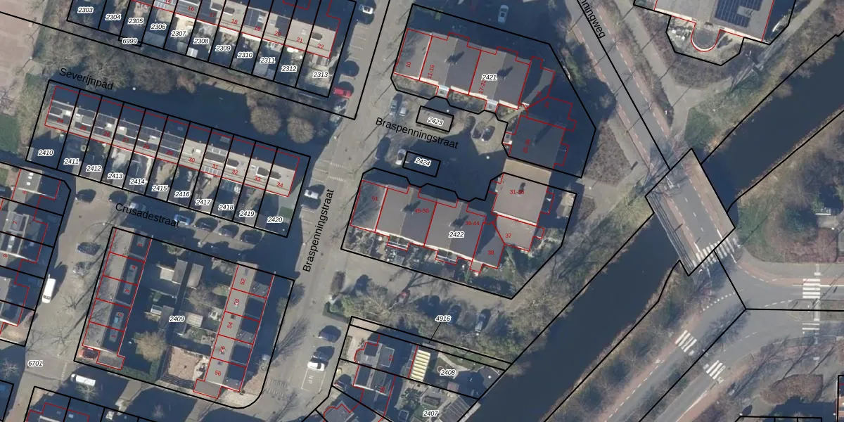 Braspenningstraat 45 is gelegen op kadastraal perceel AMR01I2422. Deze kadastrale aanduiding is uniek en wordt gebruikt door het Kadaster om eigendomsrechten en andere zakelijke rechten vast te leggen. Het perceel maakt onderdeel uit van de kadastrale gemeente Alkmaar.