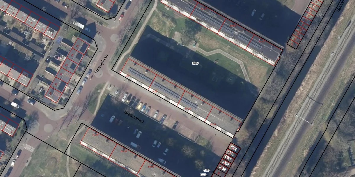 Het perceel waarop Breitnerhof 16 staat heeft een oppervlakte van 4564 m². Dit is een zeer groot perceel. De perceeloppervlakte wordt geregistreerd door het Kadaster. Gedetailleerde informatie over de maten van dit perceel kunt u vinden in het rapport Kadastrale kaart met maatvoering van Breitnerhof 16.