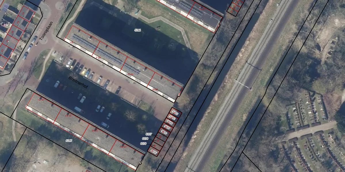 Het perceel waarop Breitnerhof 30 staat heeft een oppervlakte van 4564 m². Dit is een zeer groot perceel. De perceeloppervlakte wordt geregistreerd door het Kadaster. Gedetailleerde informatie over de maten van dit perceel kunt u vinden in het rapport Kadastrale kaart met maatvoering van Breitnerhof 30.
