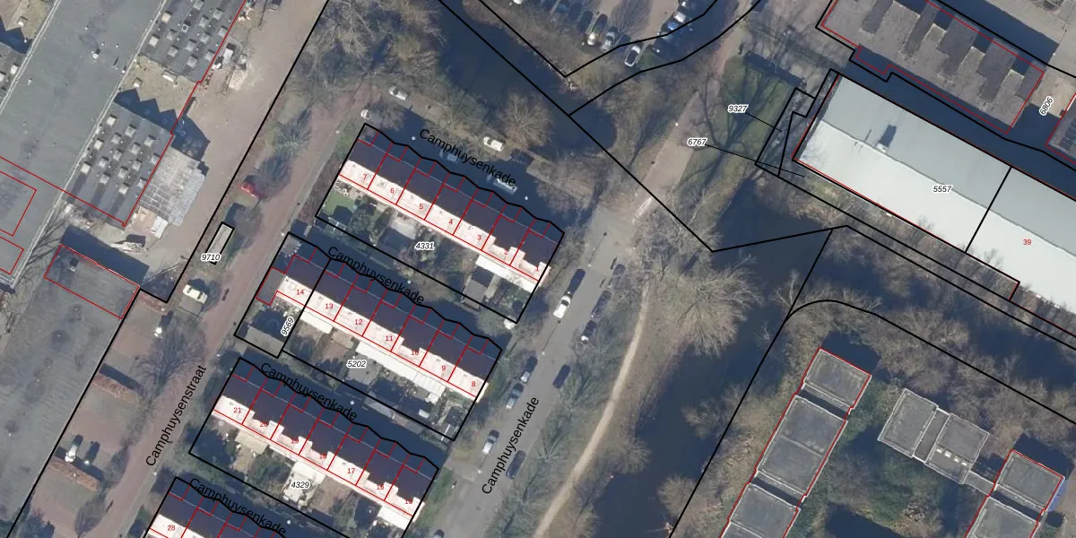 Het perceel waarop Camphuysenkade 1 staat heeft een oppervlakte van 814 m². Dit is een groot perceel. De perceeloppervlakte wordt geregistreerd door het Kadaster. Gedetailleerde informatie over de maten van dit perceel kunt u vinden in het rapport Kadastrale kaart met maatvoering van Camphuysenkade 1.
