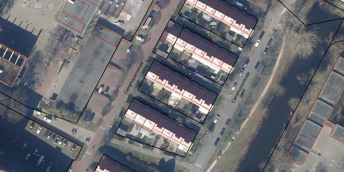 Het perceel waarop Camphuysenkade 19 staat heeft een oppervlakte van 836 m². Dit is een groot perceel. De perceeloppervlakte wordt geregistreerd door het Kadaster. Gedetailleerde informatie over de maten van dit perceel kunt u vinden in het rapport Kadastrale kaart met maatvoering van Camphuysenkade 19.