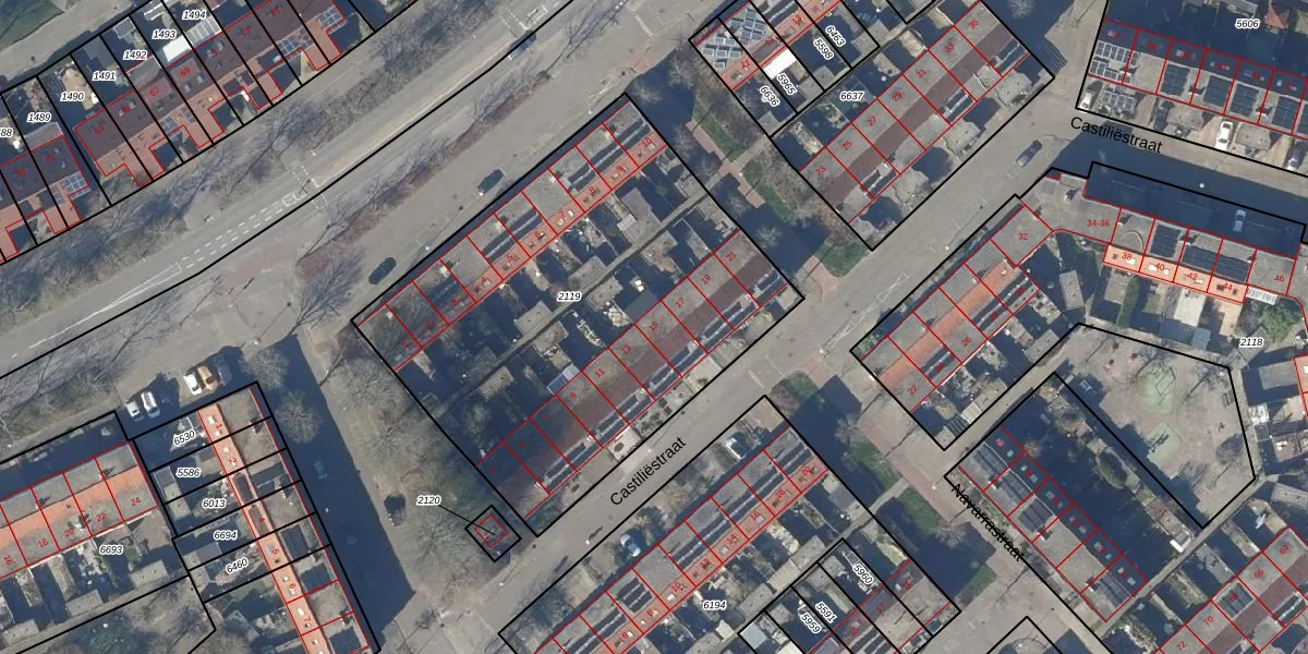 Het perceel waarop Castiliëstraat 15 staat heeft een oppervlakte van 2330 m². Dit is een zeer groot perceel. De perceeloppervlakte wordt geregistreerd door het Kadaster. Gedetailleerde informatie over de maten van dit perceel kunt u vinden in het rapport Kadastrale kaart met maatvoering van Castiliëstraat 15.