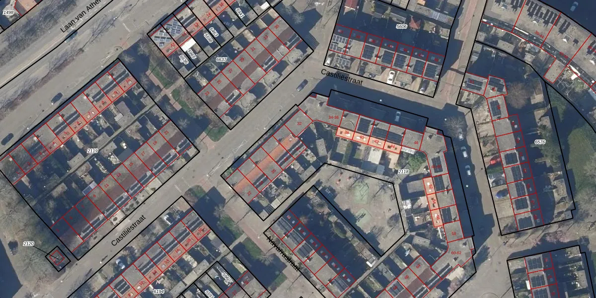 Het perceel waarop Castiliëstraat 30 staat heeft een oppervlakte van 4078 m². Dit is een zeer groot perceel. De perceeloppervlakte wordt geregistreerd door het Kadaster. Gedetailleerde informatie over de maten van dit perceel kunt u vinden in het rapport Kadastrale kaart met maatvoering van Castiliëstraat 30.