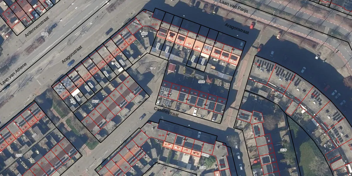 Het perceel waarop Castiliëstraat 39 staat heeft een oppervlakte van 1650 m². Dit is een zeer groot perceel. De perceeloppervlakte wordt geregistreerd door het Kadaster. Gedetailleerde informatie over de maten van dit perceel kunt u vinden in het rapport Kadastrale kaart met maatvoering van Castiliëstraat 39.