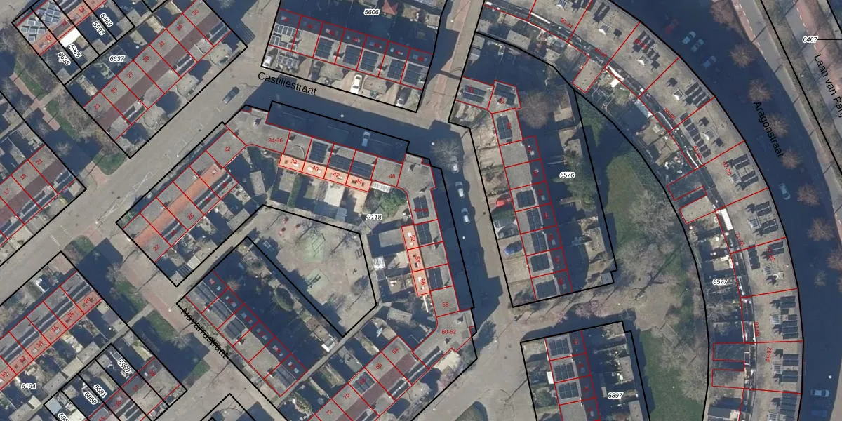 Het perceel waarop Castiliëstraat 50 staat heeft een oppervlakte van 4078 m². Dit is een zeer groot perceel. De perceeloppervlakte wordt geregistreerd door het Kadaster. Gedetailleerde informatie over de maten van dit perceel kunt u vinden in het rapport Kadastrale kaart met maatvoering van Castiliëstraat 50.