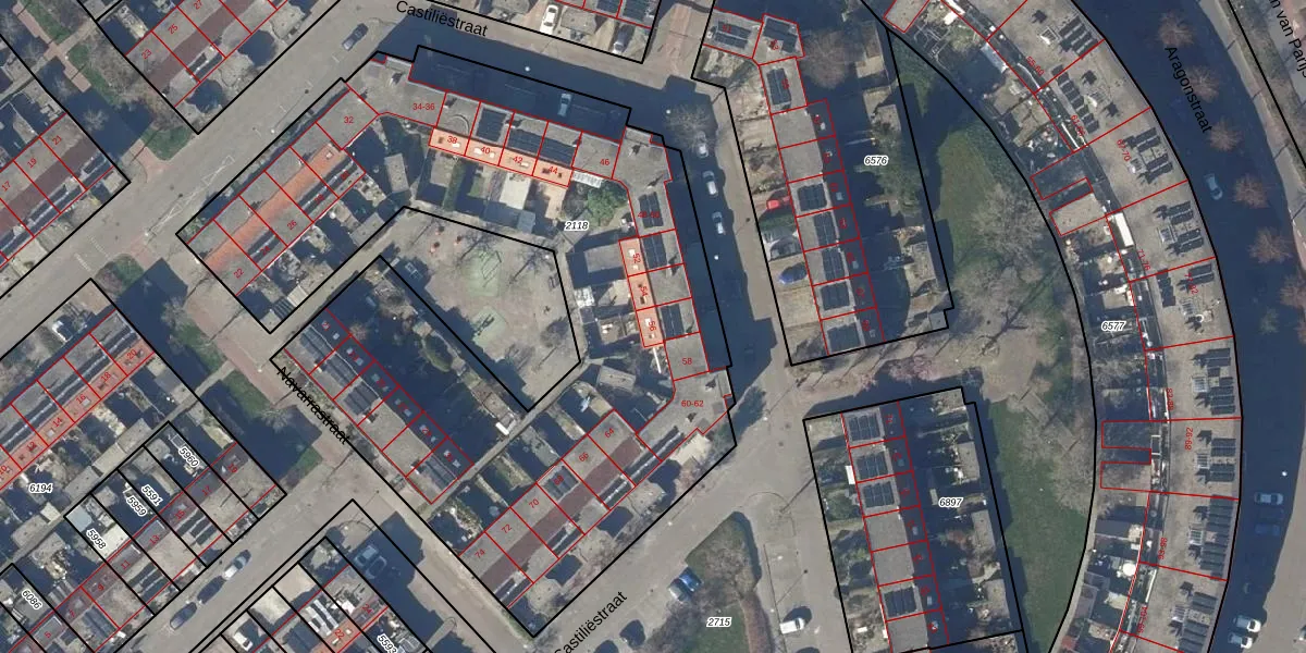 Het perceel waarop Castiliëstraat 56 staat heeft een oppervlakte van 4078 m². Dit is een zeer groot perceel. De perceeloppervlakte wordt geregistreerd door het Kadaster. Gedetailleerde informatie over de maten van dit perceel kunt u vinden in het rapport Kadastrale kaart met maatvoering van Castiliëstraat 56.