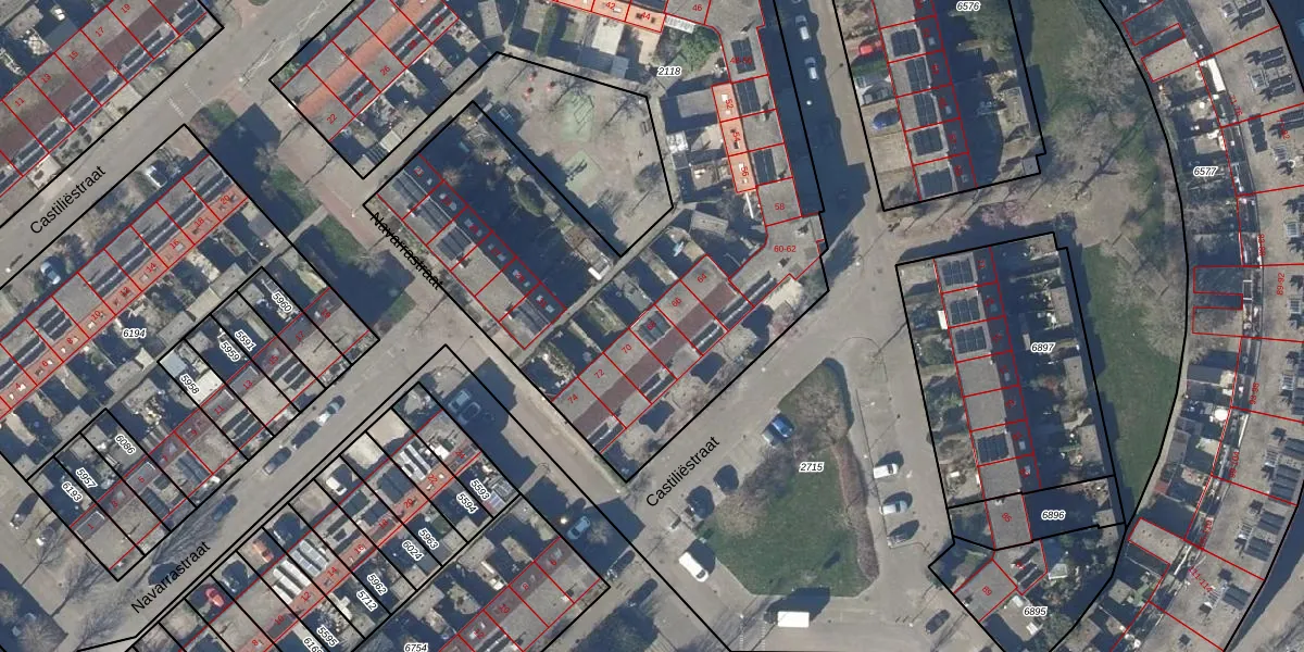 Het perceel waarop Castiliëstraat 68 staat heeft een oppervlakte van 4078 m². Dit is een zeer groot perceel. De perceeloppervlakte wordt geregistreerd door het Kadaster. Gedetailleerde informatie over de maten van dit perceel kunt u vinden in het rapport Kadastrale kaart met maatvoering van Castiliëstraat 68.