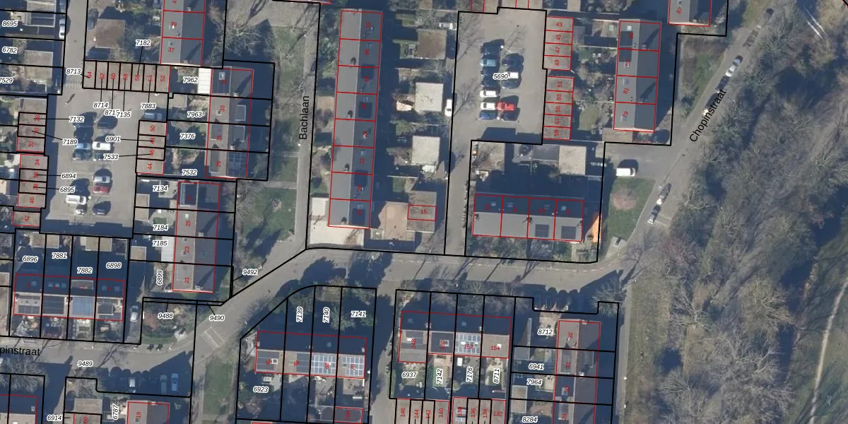 Het perceel waarop Chopinstraat 15 staat heeft een oppervlakte van 6872 m². Dit is een zeer groot perceel. De perceeloppervlakte wordt geregistreerd door het Kadaster. Gedetailleerde informatie over de maten van dit perceel kunt u vinden in het rapport Kadastrale kaart met maatvoering van Chopinstraat 15.