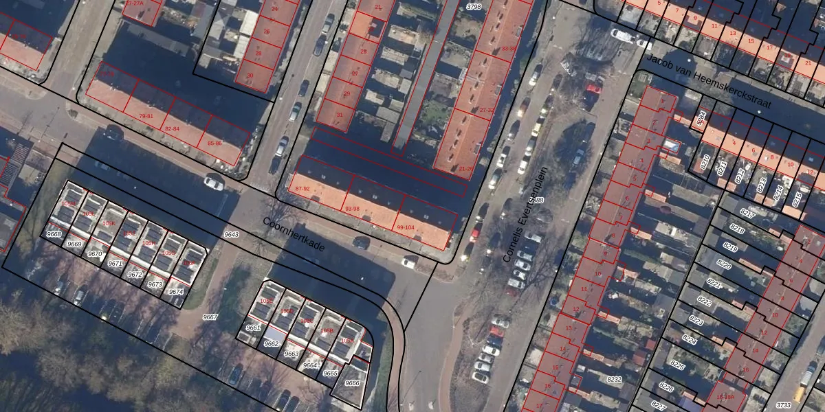 Het perceel waarop Coornhertkade 101 staat heeft een oppervlakte van 4565 m². Dit is een zeer groot perceel. De perceeloppervlakte wordt geregistreerd door het Kadaster. Gedetailleerde informatie over de maten van dit perceel kunt u vinden in het rapport Kadastrale kaart met maatvoering van Coornhertkade 101.