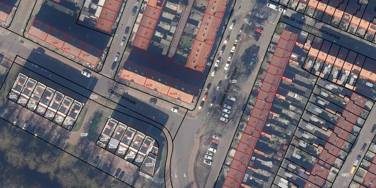 Het perceel waarop Coornhertkade 103 staat heeft een oppervlakte van 4565 m². Dit is een zeer groot perceel. De perceeloppervlakte wordt geregistreerd door het Kadaster. Gedetailleerde informatie over de maten van dit perceel kunt u vinden in het rapport Kadastrale kaart met maatvoering van Coornhertkade 103.