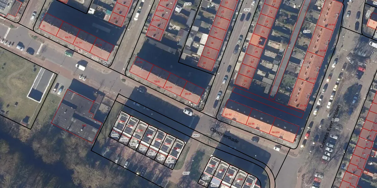 Het perceel waarop Coornhertkade 85 staat heeft een oppervlakte van 2835 m². Dit is een zeer groot perceel. De perceeloppervlakte wordt geregistreerd door het Kadaster. Gedetailleerde informatie over de maten van dit perceel kunt u vinden in het rapport Kadastrale kaart met maatvoering van Coornhertkade 85.