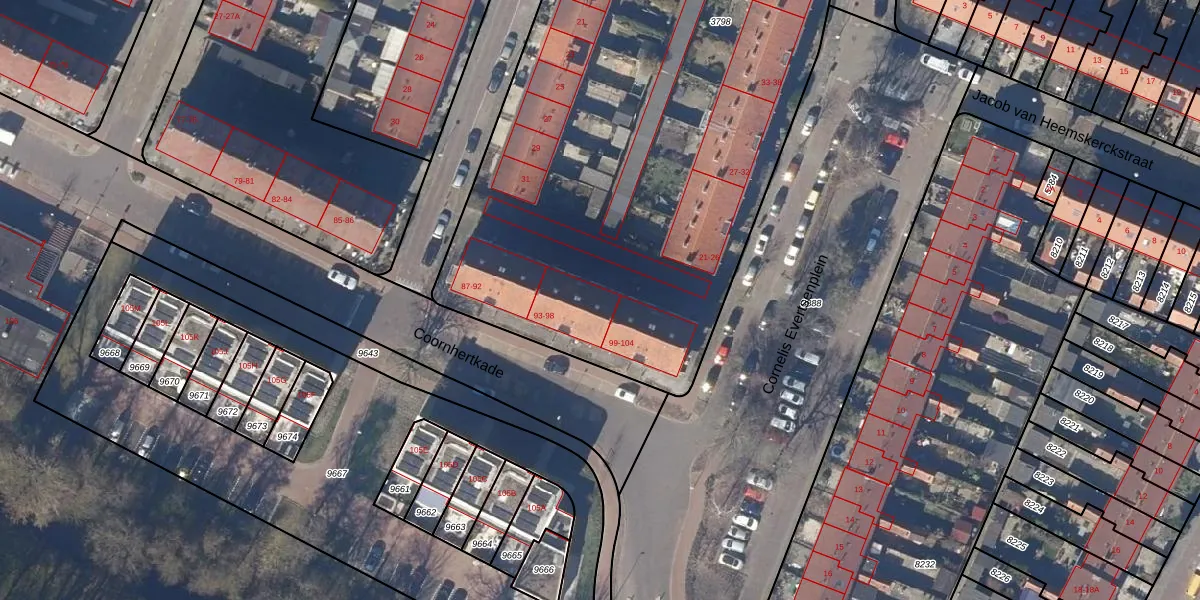 Het perceel waarop Coornhertkade 98 staat heeft een oppervlakte van 4565 m². Dit is een zeer groot perceel. De perceeloppervlakte wordt geregistreerd door het Kadaster. Gedetailleerde informatie over de maten van dit perceel kunt u vinden in het rapport Kadastrale kaart met maatvoering van Coornhertkade 98.