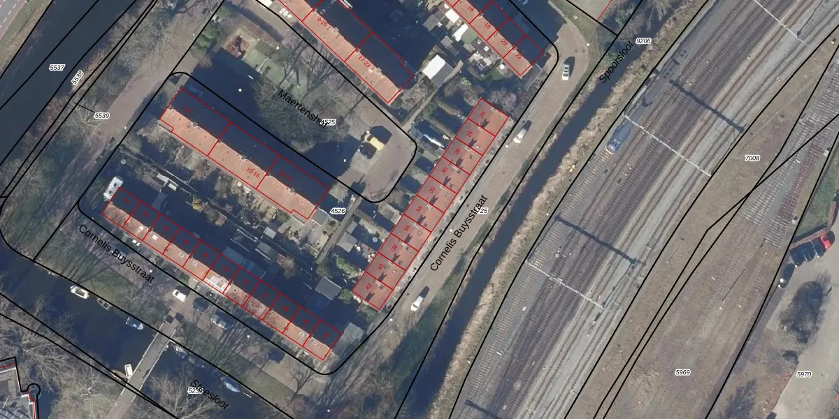 Het perceel waarop Cornelis Buysstraat 34 staat heeft een oppervlakte van 6420 m². Dit is een zeer groot perceel. De perceeloppervlakte wordt geregistreerd door het Kadaster. Gedetailleerde informatie over de maten van dit perceel kunt u vinden in het rapport Kadastrale kaart met maatvoering van Cornelis Buysstraat 34.