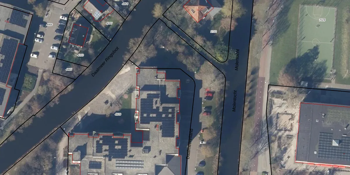 Het perceel waarop Daalmeereiland 28 staat heeft een oppervlakte van 4281 m². Dit is een zeer groot perceel. De perceeloppervlakte wordt geregistreerd door het Kadaster. Gedetailleerde informatie over de maten van dit perceel kunt u vinden in het rapport Kadastrale kaart met maatvoering van Daalmeereiland 28.