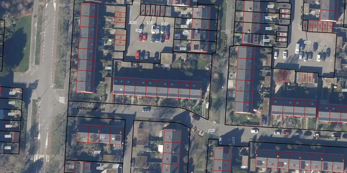Het perceel waarop Debussystraat 13 staat heeft een oppervlakte van 4564 m². Dit is een zeer groot perceel. De perceeloppervlakte wordt geregistreerd door het Kadaster. Gedetailleerde informatie over de maten van dit perceel kunt u vinden in het rapport Kadastrale kaart met maatvoering van Debussystraat 13.