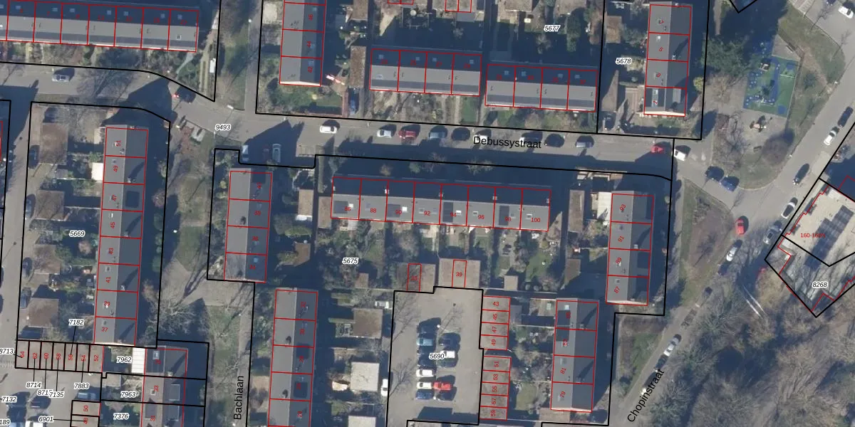 Het perceel waarop Debussystraat 92 staat heeft een oppervlakte van 6872 m². Dit is een zeer groot perceel. De perceeloppervlakte wordt geregistreerd door het Kadaster. Gedetailleerde informatie over de maten van dit perceel kunt u vinden in het rapport Kadastrale kaart met maatvoering van Debussystraat 92.