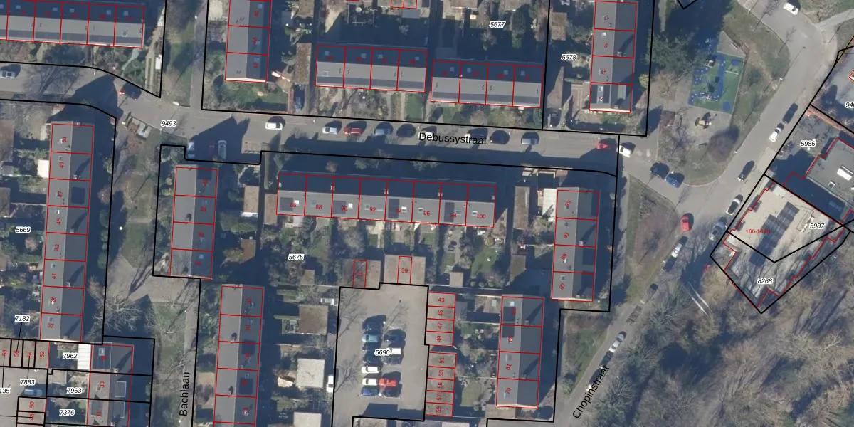 Het perceel waarop Debussystraat 96 staat heeft een oppervlakte van 6872 m². Dit is een zeer groot perceel. De perceeloppervlakte wordt geregistreerd door het Kadaster. Gedetailleerde informatie over de maten van dit perceel kunt u vinden in het rapport Kadastrale kaart met maatvoering van Debussystraat 96.