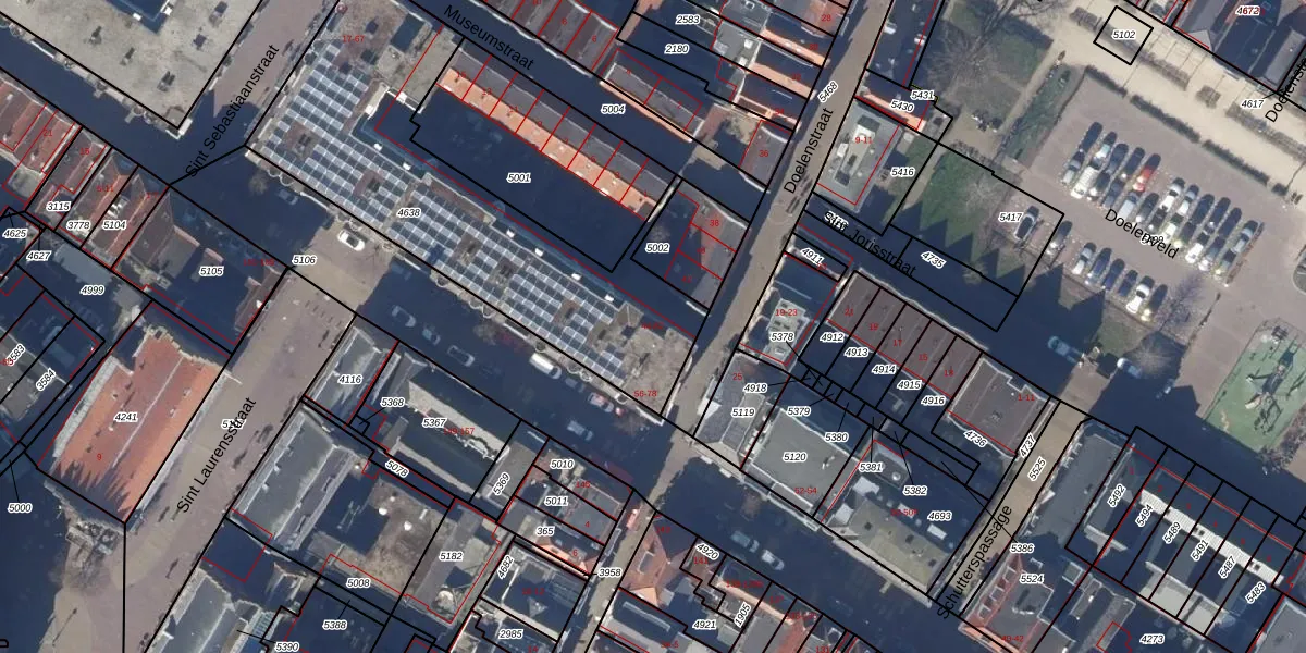 Het perceel waarop Doelenstraat 44 staat heeft een oppervlakte van 1488 m². Dit is een zeer groot perceel. De perceeloppervlakte wordt geregistreerd door het Kadaster. Gedetailleerde informatie over de maten van dit perceel kunt u vinden in het rapport Kadastrale kaart met maatvoering van Doelenstraat 44.