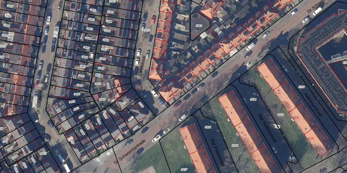 Het perceel waarop Dr.Schaepmankade 22 staat heeft een oppervlakte van 4910 m². Dit is een zeer groot perceel. De perceeloppervlakte wordt geregistreerd door het Kadaster. Gedetailleerde informatie over de maten van dit perceel kunt u vinden in het rapport Kadastrale kaart met maatvoering van Dr.Schaepmankade 22.