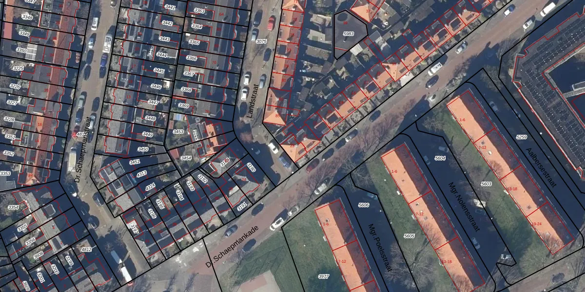 Het perceel waarop Dr.Schaepmankade 23 staat heeft een oppervlakte van 4910 m². Dit is een zeer groot perceel. De perceeloppervlakte wordt geregistreerd door het Kadaster. Gedetailleerde informatie over de maten van dit perceel kunt u vinden in het rapport Kadastrale kaart met maatvoering van Dr.Schaepmankade 23.