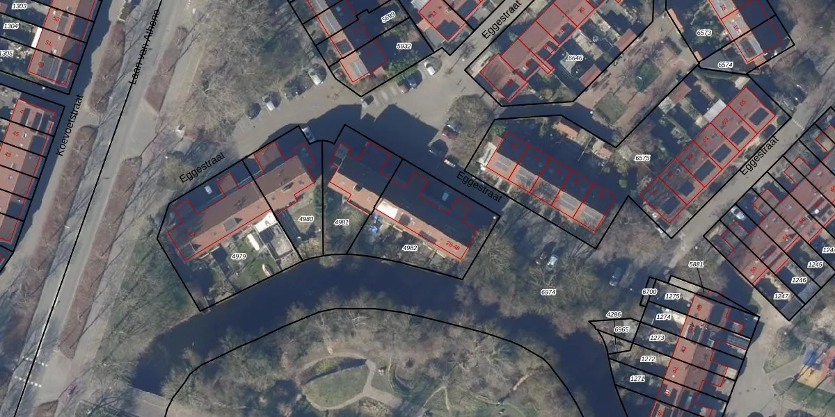 Het perceel waarop Eggestraat 32 staat heeft een oppervlakte van 583 m². Dit is een groot perceel. De perceeloppervlakte wordt geregistreerd door het Kadaster. Gedetailleerde informatie over de maten van dit perceel kunt u vinden in het rapport Kadastrale kaart met maatvoering van Eggestraat 32.