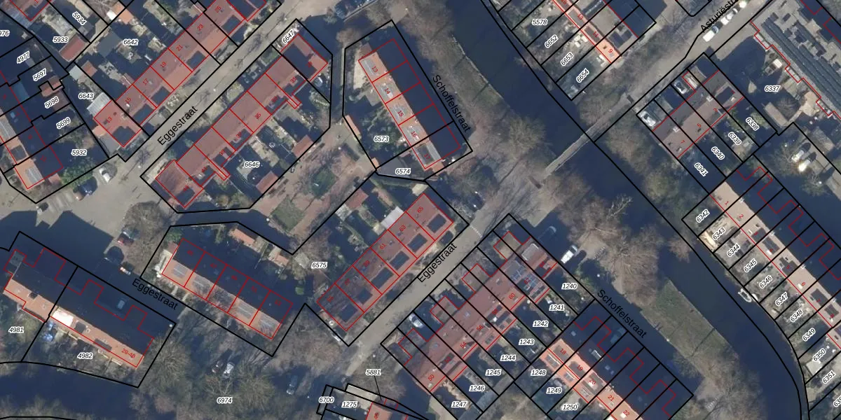 Het perceel waarop Eggestraat 65 staat heeft een oppervlakte van 1703 m². Dit is een zeer groot perceel. De perceeloppervlakte wordt geregistreerd door het Kadaster. Gedetailleerde informatie over de maten van dit perceel kunt u vinden in het rapport Kadastrale kaart met maatvoering van Eggestraat 65.