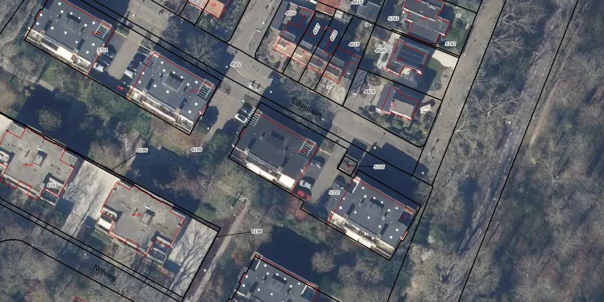 Het perceel waarop Eikenlaan 15 staat heeft een oppervlakte van 1340 m². Dit is een zeer groot perceel. De perceeloppervlakte wordt geregistreerd door het Kadaster. Gedetailleerde informatie over de maten van dit perceel kunt u vinden in het rapport Kadastrale kaart met maatvoering van Eikenlaan 15.
