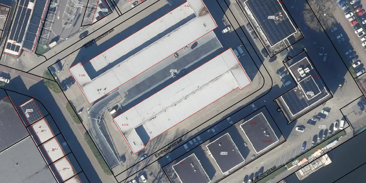 Het perceel waarop Einthovenstraat 155 staat heeft een oppervlakte van 6835 m². Dit is een zeer groot perceel. De perceeloppervlakte wordt geregistreerd door het Kadaster. Gedetailleerde informatie over de maten van dit perceel kunt u vinden in het rapport Kadastrale kaart met maatvoering van Einthovenstraat 155.