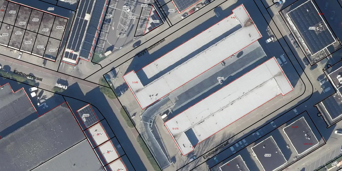 Het perceel waarop Einthovenstraat 77 staat heeft een oppervlakte van 6835 m². Dit is een zeer groot perceel. De perceeloppervlakte wordt geregistreerd door het Kadaster. Gedetailleerde informatie over de maten van dit perceel kunt u vinden in het rapport Kadastrale kaart met maatvoering van Einthovenstraat 77.