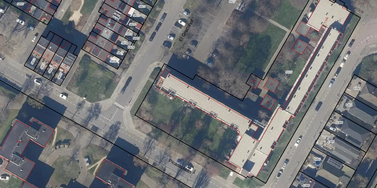 Het perceel waarop El Grecohof 42 staat heeft een oppervlakte van 4679 m². Dit is een zeer groot perceel. De perceeloppervlakte wordt geregistreerd door het Kadaster. Gedetailleerde informatie over de maten van dit perceel kunt u vinden in het rapport Kadastrale kaart met maatvoering van El Grecohof 42.