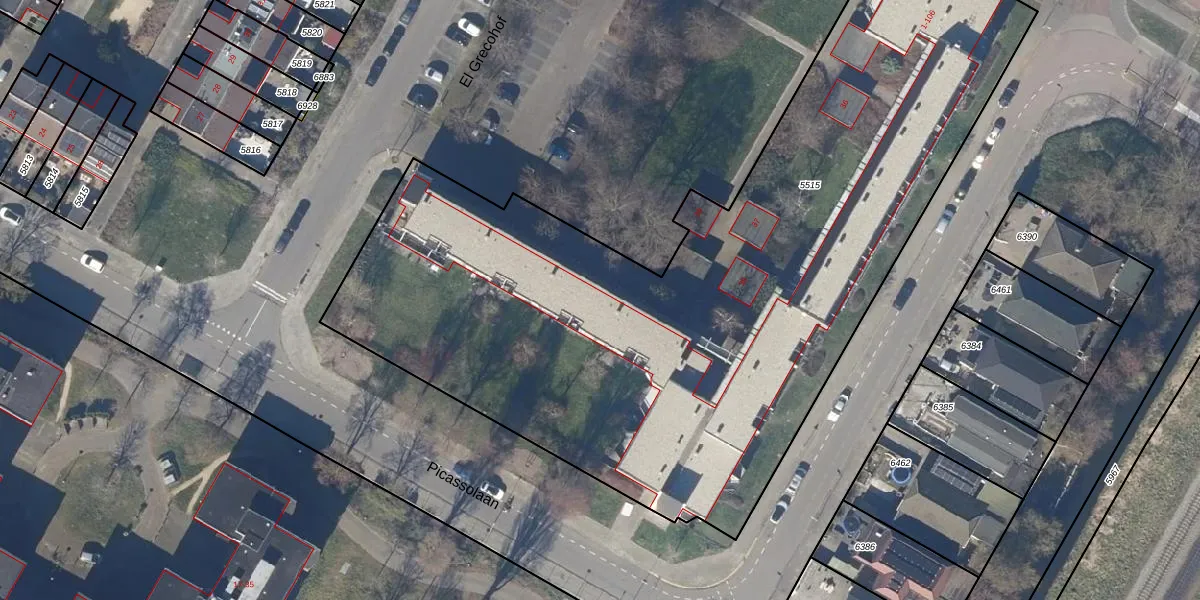Het perceel waarop El Grecohof 7 staat heeft een oppervlakte van 4679 m². Dit is een zeer groot perceel. De perceeloppervlakte wordt geregistreerd door het Kadaster. Gedetailleerde informatie over de maten van dit perceel kunt u vinden in het rapport Kadastrale kaart met maatvoering van El Grecohof 7.