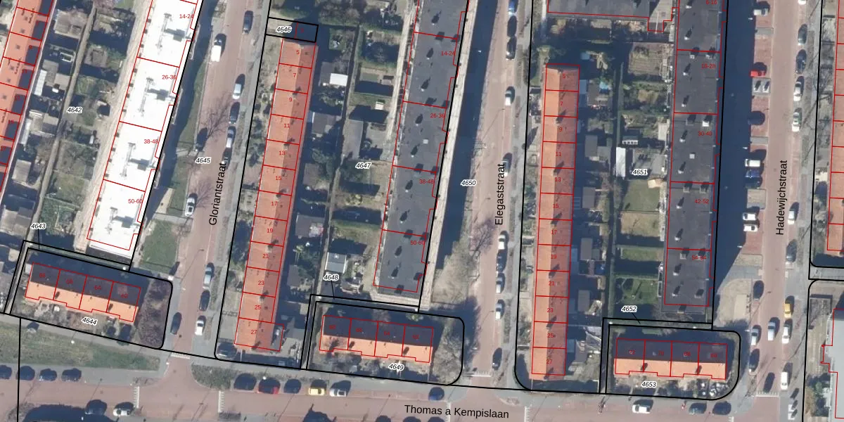 Het perceel waarop Elegaststraat 40 staat heeft een oppervlakte van 4112 m². Dit is een zeer groot perceel. De perceeloppervlakte wordt geregistreerd door het Kadaster. Gedetailleerde informatie over de maten van dit perceel kunt u vinden in het rapport Kadastrale kaart met maatvoering van Elegaststraat 40.