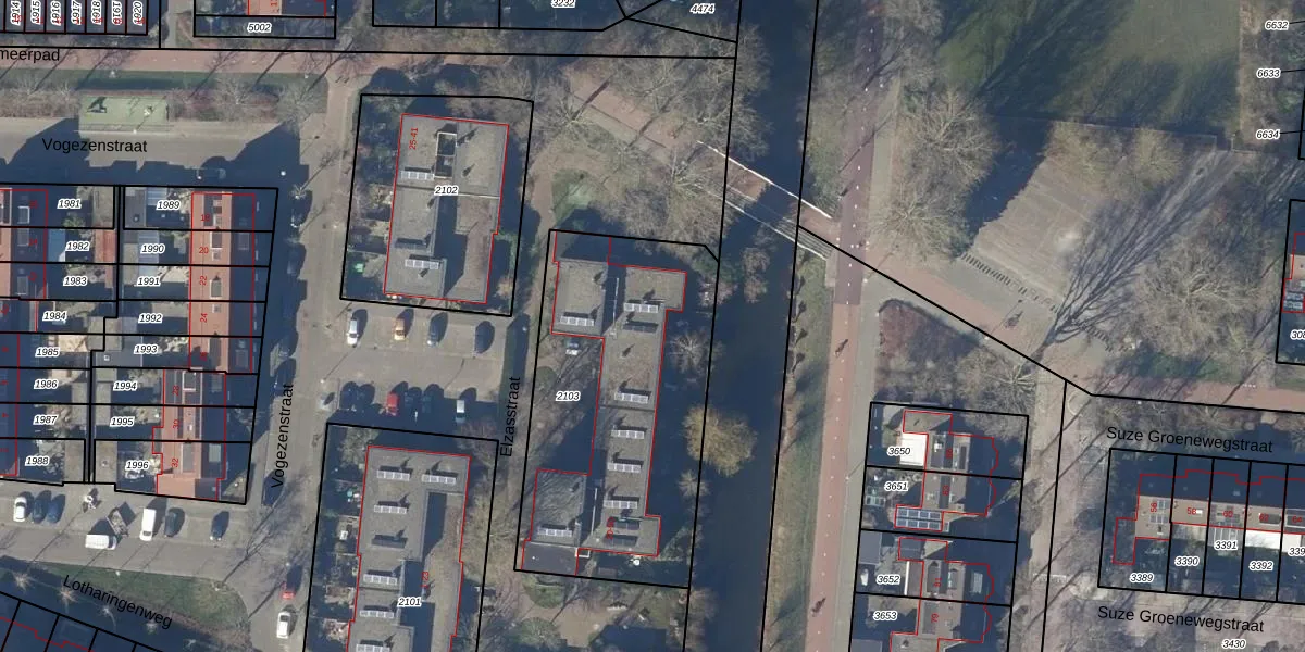 Het perceel waarop Elzasstraat 34 staat heeft een oppervlakte van 1394 m². Dit is een zeer groot perceel. De perceeloppervlakte wordt geregistreerd door het Kadaster. Gedetailleerde informatie over de maten van dit perceel kunt u vinden in het rapport Kadastrale kaart met maatvoering van Elzasstraat 34.