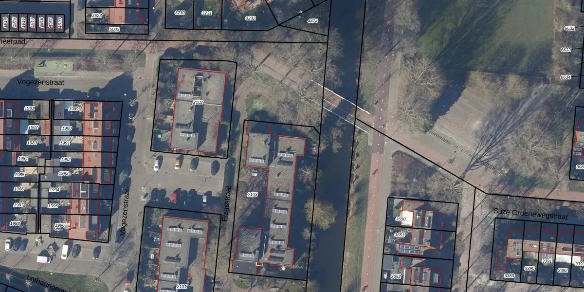 Het perceel waarop Elzasstraat 38 staat heeft een oppervlakte van 1394 m². Dit is een zeer groot perceel. De perceeloppervlakte wordt geregistreerd door het Kadaster. Gedetailleerde informatie over de maten van dit perceel kunt u vinden in het rapport Kadastrale kaart met maatvoering van Elzasstraat 38.