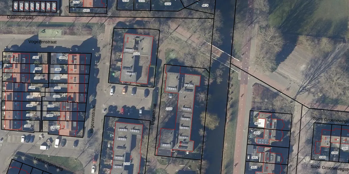 Het perceel waarop Elzasstraat 46 staat heeft een oppervlakte van 1394 m². Dit is een zeer groot perceel. De perceeloppervlakte wordt geregistreerd door het Kadaster. Gedetailleerde informatie over de maten van dit perceel kunt u vinden in het rapport Kadastrale kaart met maatvoering van Elzasstraat 46.
