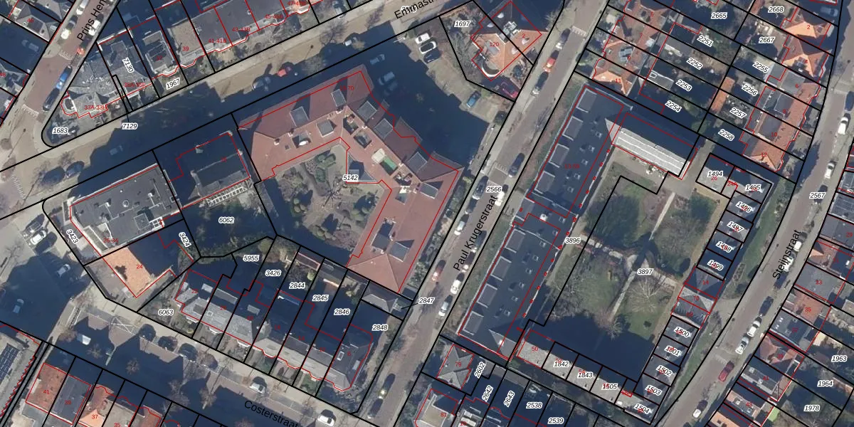 Het perceel waarop Emmastraat 26 staat heeft een oppervlakte van 2539 m². Dit is een zeer groot perceel. De perceeloppervlakte wordt geregistreerd door het Kadaster. Gedetailleerde informatie over de maten van dit perceel kunt u vinden in het rapport Kadastrale kaart met maatvoering van Emmastraat 26.